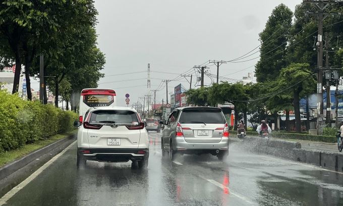 Giữ khoảng cách với phương tiện phía trước khi trời mưa để tránh nước bắn vào xe. Ảnh: Phạm Hải