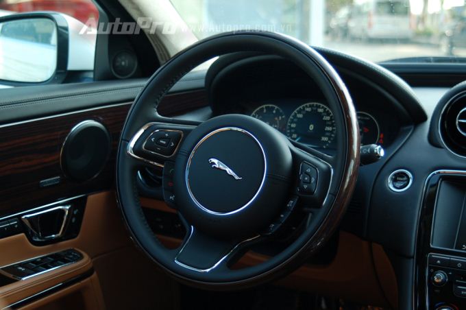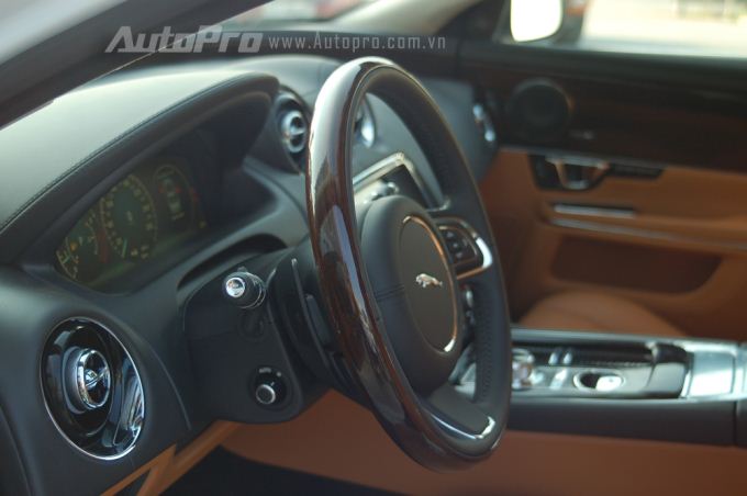 Trái ngược với tông màu trắng ngà ở ngoại thất, bên trong khoang lái chiếc Jaguar XJL 2016 này là nội thất màu da bò và đen được phối hài hòa với nhau. Ngoài ra, các chi tiết được ốp gỗ cũng mang đến không gian nội thất đẳng cấp và sang trọng.
