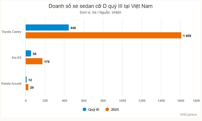 Lũy kế 2025 của Camry bàn giao tổng 1.609 xe, dẫn đầu phân khúc. Tiếp đến là các thứ hạng tiếp theo, K5 bán 176 xe và Accord chỉ 29 xe.