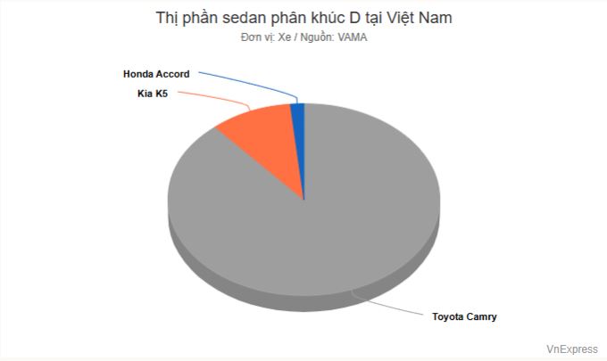 Toyota Camry duy trì vị thế dẫn đầu phân khúc với doanh số quý III đạt 446 xe, chiếm 86,4% thị phần với tổng 516 xe. Tương ứng lượng bán của Camry gấp 6,4 lần cả phân khúc cộng lại. Xét theo tháng, doanh số Camry giảm dần từ tháng 7 với 193 xe, tháng 8 giảm xuống 175 và tháng 9 chỉ bán 78 xe.