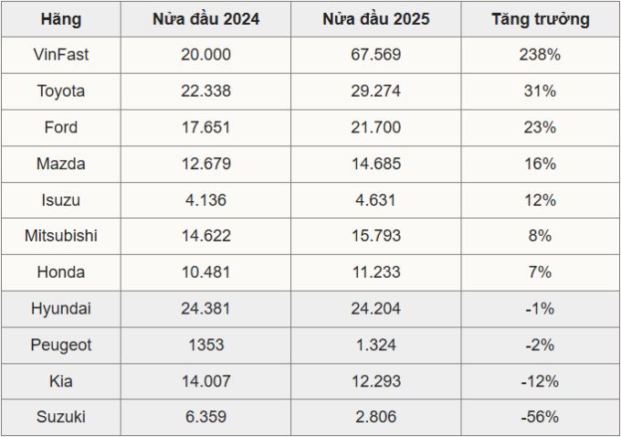 Với các hãng tăng trưởng doanh số, VinFast là cái tên đặc biệt. Hơn 67.000 xe bán ra của VinFast sau nửa đầu 2025 tương ứng mức tăng hơn 3 lần so với cùng kỳ năm ngoái. Trong danh sách 10 mẫu xe bán chạy nhất, có đến 3 mẫu thuộc hãng này, gồm VF 3, VF 5 và VF 6. Trong đó, VF 3 và VF 5 bán trên 20.000 chiếc, con số chưa từng ghi nhận với một mẫu xe nào trong nửa đầu một năm dương lịch.