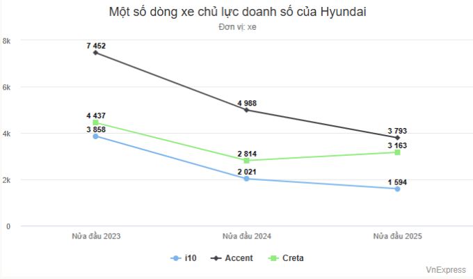 Ở phân khúc sedan cỡ B, Hyundai Accent từng cạnh tranh ngang ngửa Toyota Vios nhưng sau nửa đầu 2025, mẫu xe Hàn để đối thủ bỏ xa với khoảng cách gần 1.500 xe. Nhóm gầm cao cỡ B, Hyundai Creta và Kia Seltos từng thống trị phân khúc nhưng doanh số hiện giảm mạnh, để các đối thủ như Toyota Yaris Cross, Mitsubishi Xforce vượt mặt.