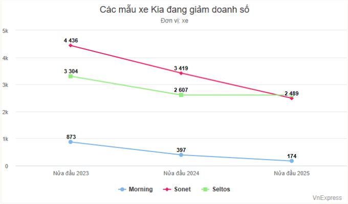 Hãng xe đồng hương của Hyundai là Kia giảm doanh số mạnh hơn (-12%). Thương hiệu được lắp ráp và phân phối bởi Trường Hải từng thuộc top 3 thị trường (khi VinFast chưa công bố số liệu bán hàng) nhưng nay xếp thứ 5, dưới cả những cái tên như Ford, Mitsubishi.