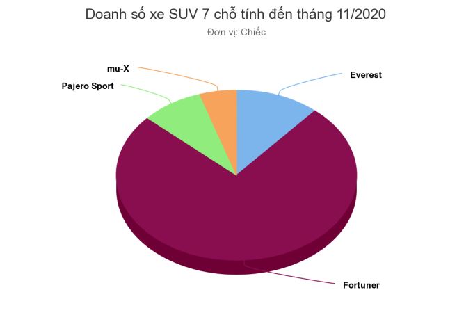 Trong phân khúc xe gầm cao cỡ D, nếu chỉ tính dòng SUV thực thụ (cấu trúc thân rời khung body-on-frame) thì doanh số Everest xếp thứ hai, sau Fortuner, nhưng trên Pajero Sport và Isuzu mu-X.