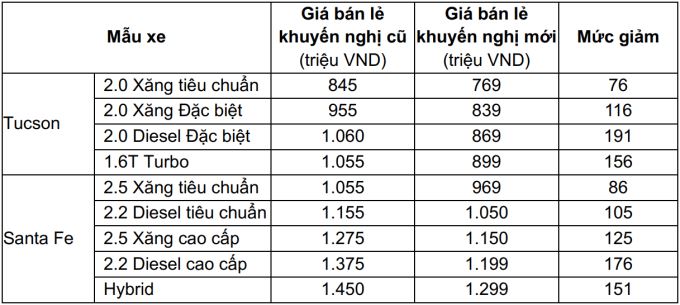 Theo đó, giá bán lẻ khuyến nghị mới dành cho hai mẫu SUV chủ lực của Hyundai là Tucson và Santa Fe (đã bao gồm thuế VAT) cụ thể như sau: