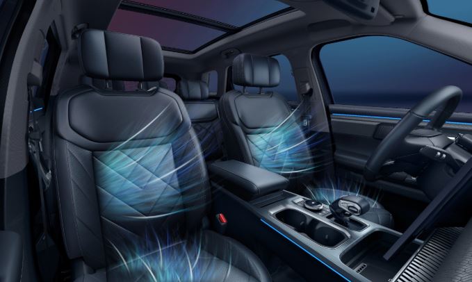Ở nội thất, xe trang bị cửa sổ trời toàn cảnh, âm thanh 8 loa Sony, ghế lái chỉnh điện kèm nhớ vị trí, sạc không dây, cốp điện rảnh tay, hộc chứa đồ làm mát, đèn viền nội thất. Điều hòa tự động kèm bộ lọc bụi mịn. Màn hình giải trí 14,8 inch, lớn hơn loại 13,2 inch trên bản tiêu chuẩn Flagship.