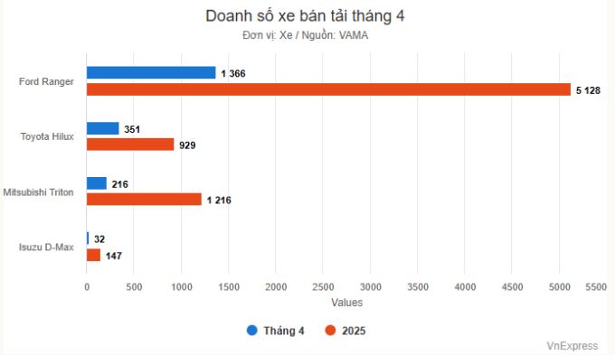 Doanh số xe bán tải tháng 4 là 1.965 xe, giảm 16% so với tháng 3, trong đó Ranger giữ ngôi đầu, Hilix lần đầu leo lên thứ hai.