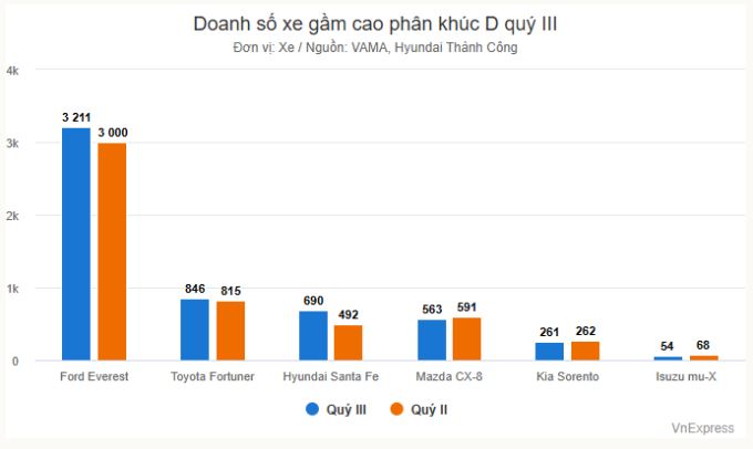 Dẫn đầu doanh số phân khúc xe gầm cao quý III thuộc về Everest. Mẫu xe SUV của Ford bán 3.211 xe, tăng 7% so với quý II. Lượng xe bàn giao trong tháng 9 của Everest đạt 1.069 xe, tăng 1,5% so với 1.053 xe tháng 8 và giảm 1,8% so với 1.089 xe tháng 7.