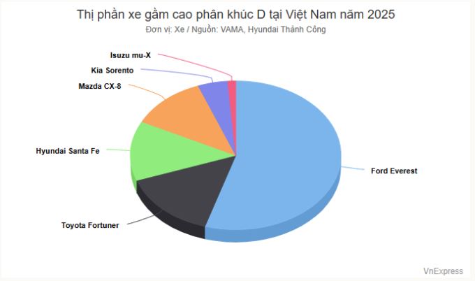 Lũy kế 9 tháng năm 2025, doanh số Everest bán nhiều nhất phân khúc với 8.345 xe, chiếm 54,6% thị phần xe gầm cao phân khúc D. Ở các thứ hạng tiếp theo lần lượt thuộc về Fortuner với 2.255 xe, chiếm 14,7% thị phần. Santa Fe bàn giao tổng 1.971 xe với 12,9% thị phần. CX-8 đạt 1.789 xe với 11,7%. Sorento bán 698 xe với 4,6% và mu-X bán 186 xe chiếm 1,2%.