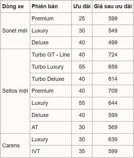 Với bộ ba xe đô thị gầm cao Kia Sonet, Seltos và Carens, Kia Việt Nam áp dụng mức giảm cao nhất 55 triệu cho Seltos, 40 triệu cho Sonet và 35 triệu đồng cho Carens. Mức giảm cụ thể cho các phiên bản của ba dòng xe này như sau: