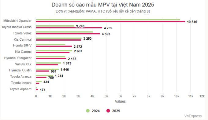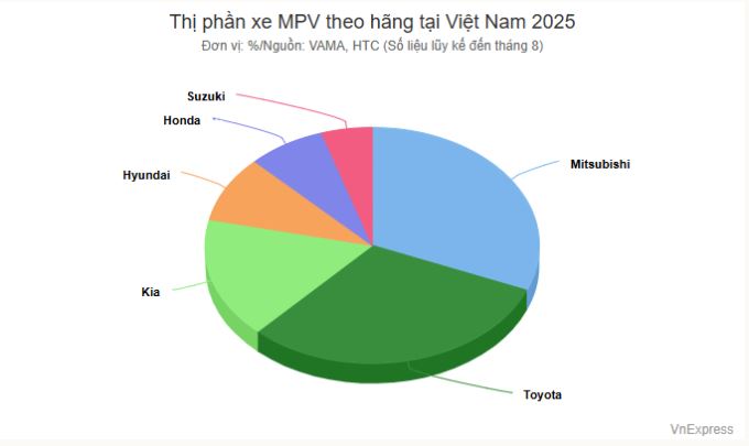 Sau 8 tháng đầu 2025, Mitsubishi chiếm hơn 31% thị phần, dẫn đầu toàn phân khúc MPV nói chung, xếp sau là Toyota 30,8%, Kia 16,5%.