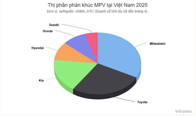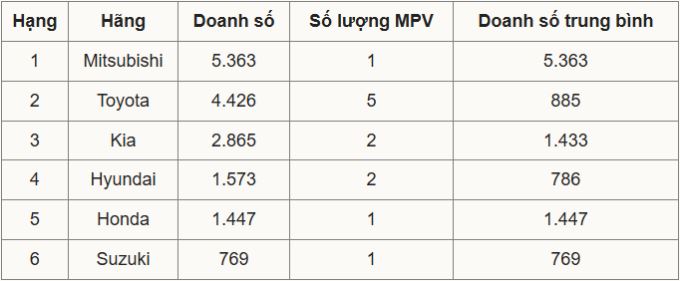 Sau 4 tháng đầu năm, Mitsubishi và Toyota là hai hãng dẫn đầu thị trường về số lượng MPV bán ra. Trong số 6 thương hiệu ghi nhận doanh số, chỉ có hai hãng Hàn Quốc, 4 của Nhật. Nếu xét hiệu quả bán hàng, Mitsubishi cũng là hãng bán hiệu quả nhất, trong khi Toyota đứng thứ hai về số lượng tổng nhưng lại kém hơn Kia, Honda về doanh số trung bình. Điều này là bởi Toyota có nhiều mẫu xe.