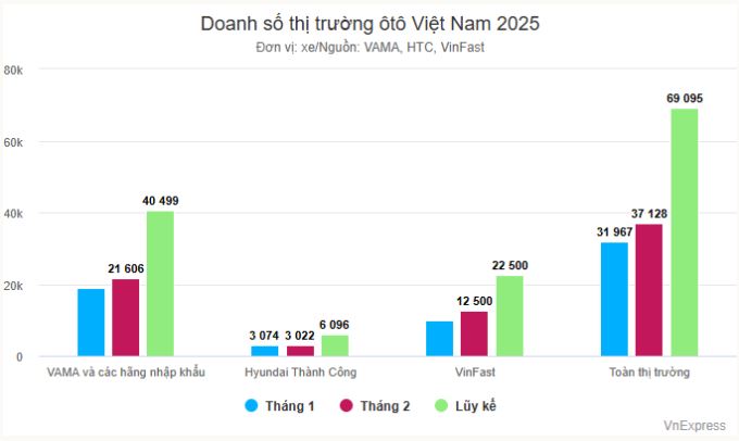 Doanh số toàn ngành, gồm VAMA, các hãng nhập khẩu và HTC trong tháng 2/2025, là 24.628 xe, tăng khoảng 80% so với cùng kỳ năm ngoái. Hồi tháng 2/2024, VinFast chưa công bố số liệu bán hàng cụ thể.