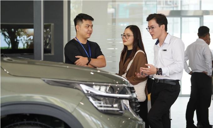 Nhân viên bán hàng của đại lý Kia trao đổi với khách hàng tại đại lý. Ảnh: Thành Nhạn