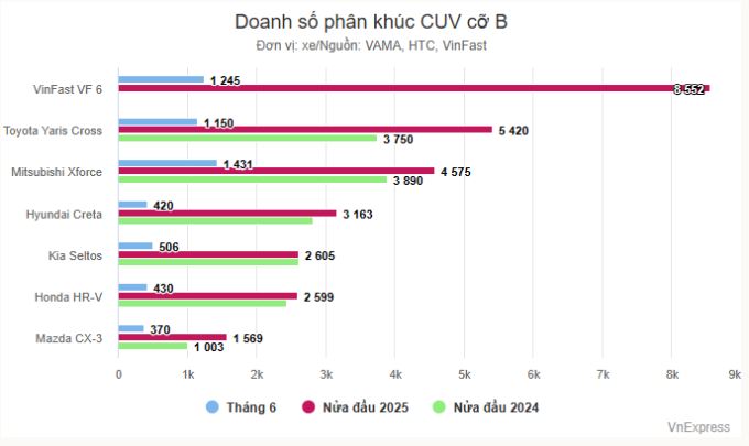 Toàn phân khúc CUV cỡ B (chỉ tính xe xăng) bán ra 19.931 chiếc trong nửa đầu 2025, tăng khoảng 21% so với cùng kỳ năm ngoái. Hồi 2024, VinFast chưa công bố doanh số cụ thể từng mẫu.
