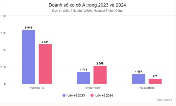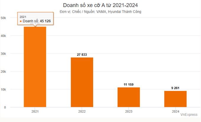 Doanh số xe cỡ A tại thị trường Việt trong 2024 là hơn 9.000 xe, sau 3 năm giảm 80% so với mức hơn 45.000 xe vào 2021.