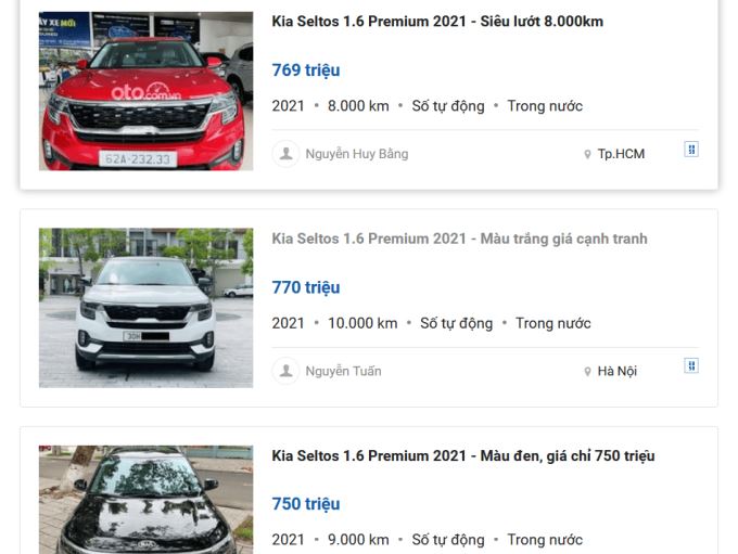 Trên thị trường xe cũ hiện nay có không ít các tin bán xe KIA Seltos 2021 bản 1.6 Premium, song đa phần đều rao giá khá cao, từ 750 - 770 triệu đồng, hơn giá xe mới tới 40 triệu đồng. Những chiếc Seltos này đều thuộc dạng "xe lướt" với số ODO ít ỏi, trong khoảng 8.000 - 10.000 km.