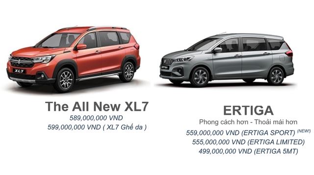 Ngoài XL7, Suzuki còn thể hiện rõ tham vọng thách thức Xpander bằng việc lấp đầy phân khúc với mẫu Ertiga. Phiên bản số sàn (5MT) được định giá 499 triệu đồng. Ertiga Limited số tự động có giá 555 triệu đồng và bản cao nhất là Ertiga Sport giá cộng thêm 4 triệu đồng.