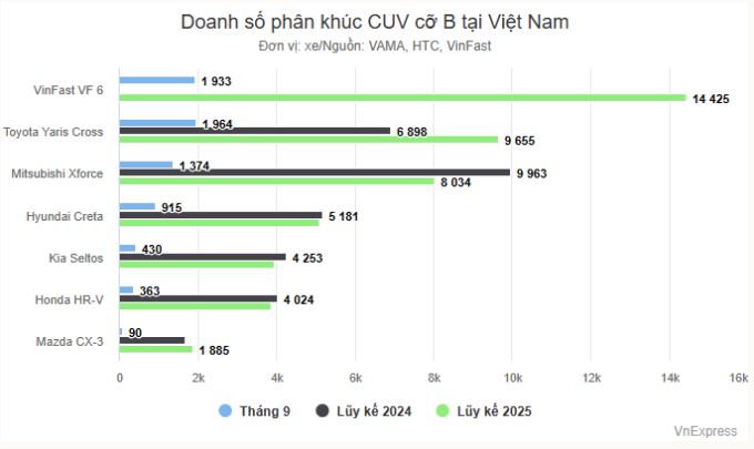 Sau ba quý đầu 2025, VF 6 chiếm đến 31% thị phần phân khúc với mức bán 14.425 xe, nhiều hơn khoảng 4.700 xe so với mẫu xe xếp thứ hai - Yaris Cross. VF 6 là mẫu xe thuần điện duy nhất công bố số liệu bán hàng.