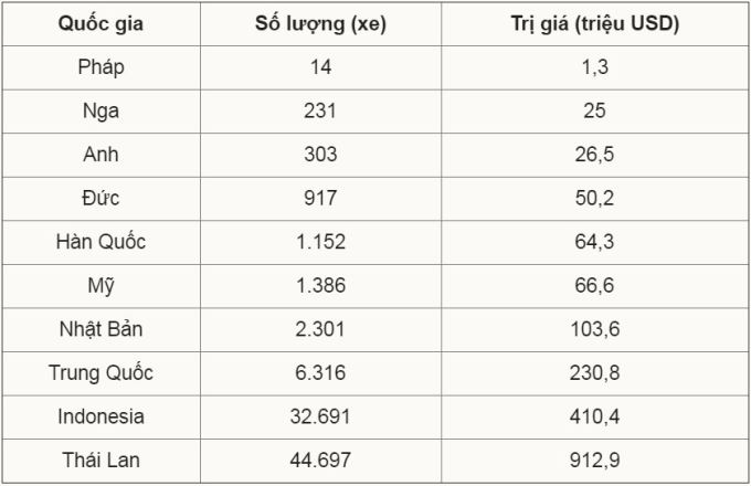 Tương tự 2019, Thái Lan, Indonesia và Trung Quốc là các nước xuất khẩu nhiều ôtô nguyên chiếc nhất sang Việt Nam. Ba quốc gia này chiếm đến 90% lượng xe nhập khẩu của nước ta.