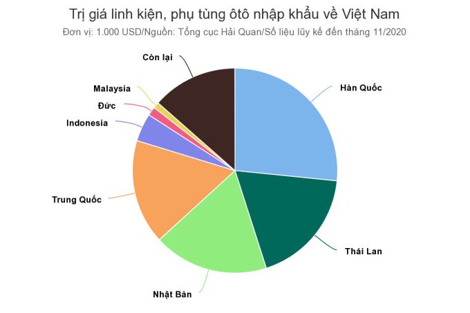 Ở mảng linh kiện, phụ tùng, xuất xứ nhập khẩu cũng đa dạng như ôtô nguyên chiếc. Tính đến tháng 11/2020, Việt Nam nhập khẩu mặt hàng này trị giá gần 3,5 tỷ USD, con số cho thấy ngành công nghiệp phụ trợ trong nước còn nhiều tiềm năng khai phá.