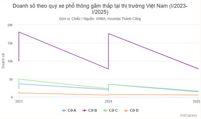 Cụ thể, doanh số của phân khúc xe gầm thấp cỡ A, B, C, và D trong quý I lần lượt là 1.422, 7.785, 1.630 và 550 xe. Đối với phân khúc A và C, đây là quý có mức bán thấp nhất trong vòng ba năm qua. Đối với phân khúc B và D là thấp nhì, trong đó phân khúc B chỉ hơn quý I/2024 (7.734 xe), còn phân khúc D cũng chỉ hơn mức bán của quý I/2024 (526 xe).