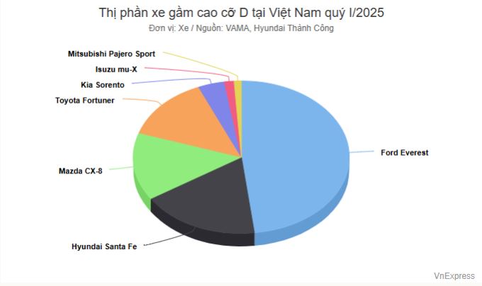 Có tới 7 mẫu xe cung cấp doanh số đều đặn nhưng Ford Everest vượt trội với gần 50% thị phần, các mẫu còn lại chia nhau "nửa miếng bánh".