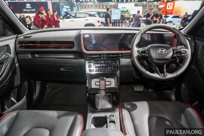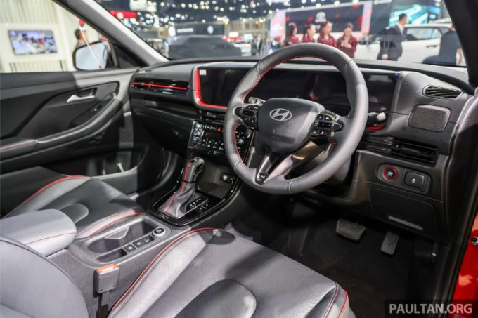 Tiện nghi tiêu biểu trên đối thủ của Xforce, Yaris Cross bao gồm tính năng thông gió hàng ghế trước, 8 loa Bose, sạc không dây chuẩn Qi, phanh tay điện tử tích hợp Auto Hold, đề máy từ xa… Với phiên bản Creta N Line, không thể bỏ qua vô-lăng 3 chấu thanh mảnh được bọc da đục lỗ nhằm hạn chế trơn trượt trong quá trình cầm lái, cần số N Line độc quyền cùng điểm nhấn màu đỏ tươi nổi bật ở nhiều nơi (Ảnh: Paultan).