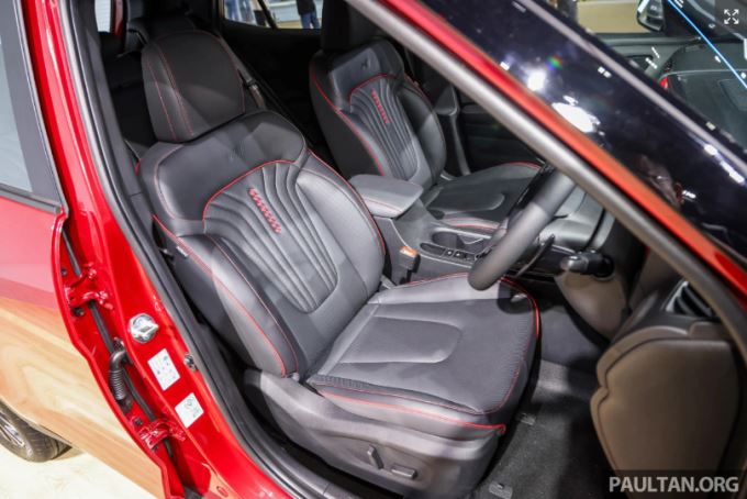 Ghế ngồi bọc da trơn có "phom" ôm người hơn với họa tiết mô phỏng lá cờ về đích, phối hợp cùng đường viền đỏ đối lập. Ghế lái chỉnh điện 8 hướng và cửa sổ trời toàn cảnh đều đã có mặt từ trước, song chưa rõ Creta facelift ở Việt Nam có bị "cắt" những trang bị này như đời xe hiện hành hay không (Ảnh: Paultan).